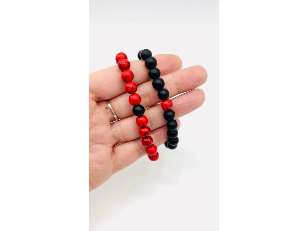 Partnerské přátelské náramky jsou módním hitem a dají se krásně kombinovat s jinými náramky. Partnerské a přátelské náramky jsou romantické a přinášení štěstí, radost a souznění s partnerem. Náramky jsou na pružném pevném silonu a přizpůsobí se zápěstí, pokud nejsou dětské nebo extrémně silné. Partnerský, přátelský náramek je vyroben z přírodních howlitových kamenů. Barva černá a červená. Průměr přírodních kamenů cca 8 mm. Tyto partnerské, přátelské náramky naleznete v naší nabídce i v jiných barvách.