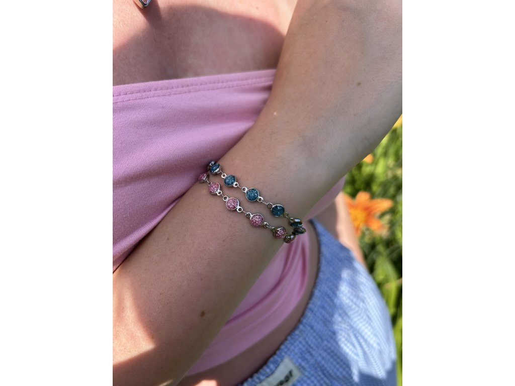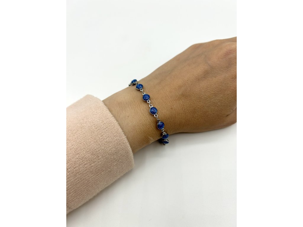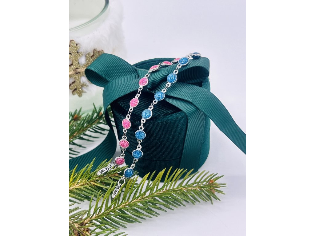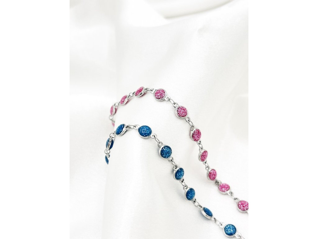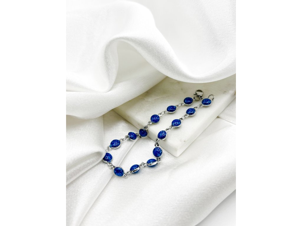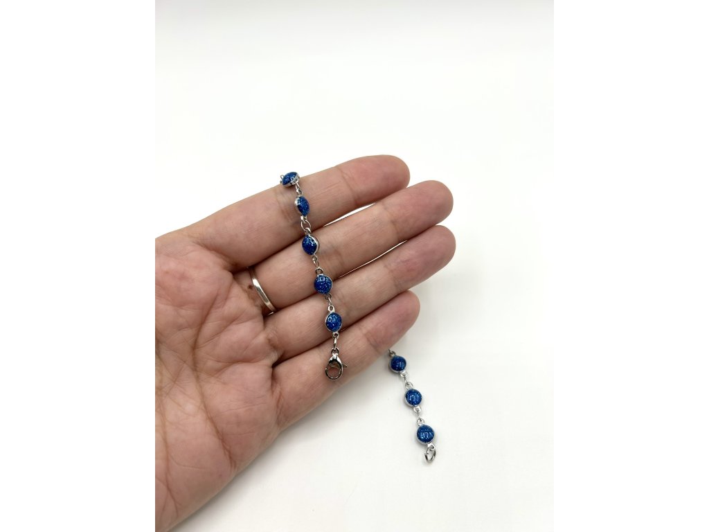 Délka náramku cca 20 cm ( lze zapnout do kteréhokoliv očka mezi modrým epoxidem), šíře cca 6 mm. Zapínání - karabinka. Do soupravy lze zakoupit i řetízek, který naleznete v příslušné kategorii.