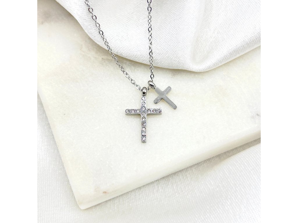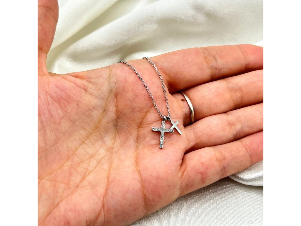 Délka řetízku nastavitelná cca 43 - 48 cm, 2 malé křížky - jeden s krystalky a jeden ocelový.. Zapínání - karabinka.