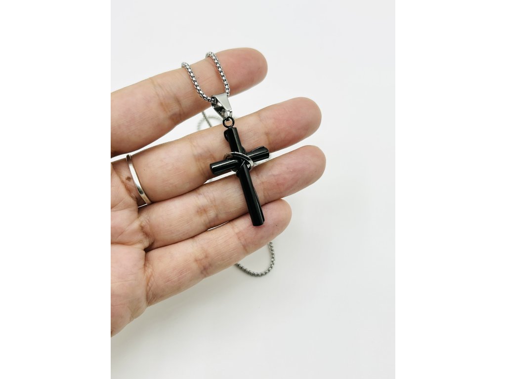 Náhrdelník černý křížek s kroužkem z chirurgické oceli NH220205